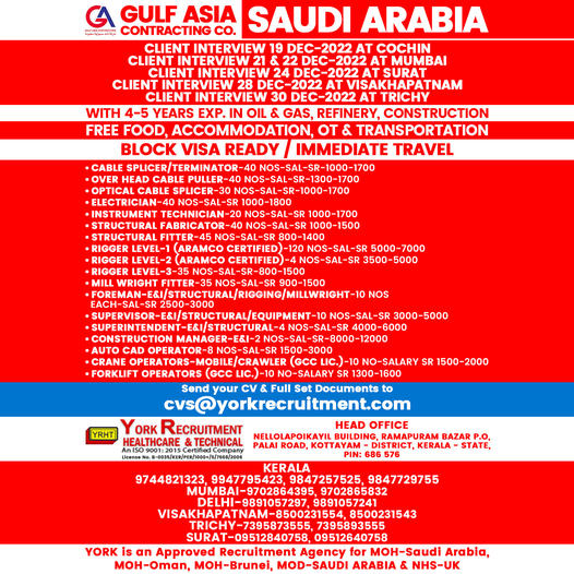 Email: cvs@yorkrecruitment.com / Kerala: 9744821323, 9947795423, 9847257525, 9847729755, Mumbai: 9702864395, 9702865832, Delhi: 9891057297, 9891057241. Visakhapatnam: 8500231554, 8500231543. Trichy : 7395873555, 7395893555. Surat : 09512840758, 09512640758