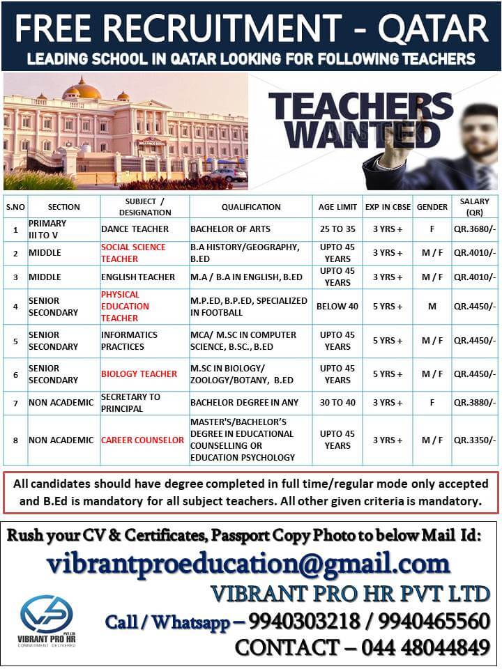 Teaching jobs in Qatar indian schools 2023 - Free recruitment