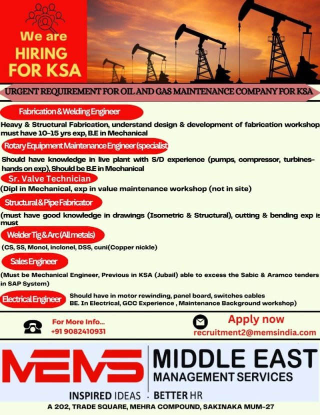 Urgent requirement for Oil & Gas Company in Saudi arabia