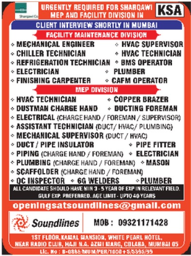 All Candidates should have Min. 3-5 years experience in relevant field. Gulf Experienced, Age Limit upto 40 years