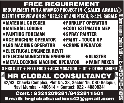 Email: hrglobalsaudicvs@gmail.com / 9321209281/8422811501