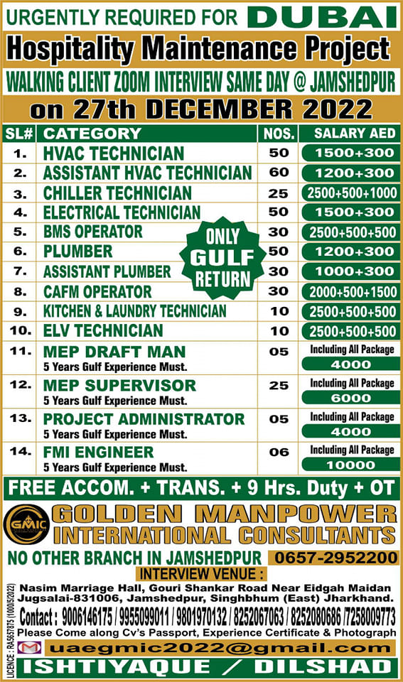 Urgent job vacancies in Dubai - Maintenance Project