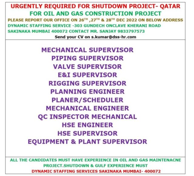 All The Candidates must have experience in Oil and Gas Maintenance Project Shutdown & Gulf experience must.