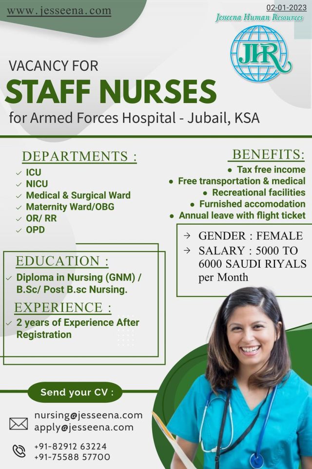 | Staff nurse - ICU/NICU/Medical & surgical ward/maternity ward/OBG/OR/RR/OPD (Female) | 6000 SAR |