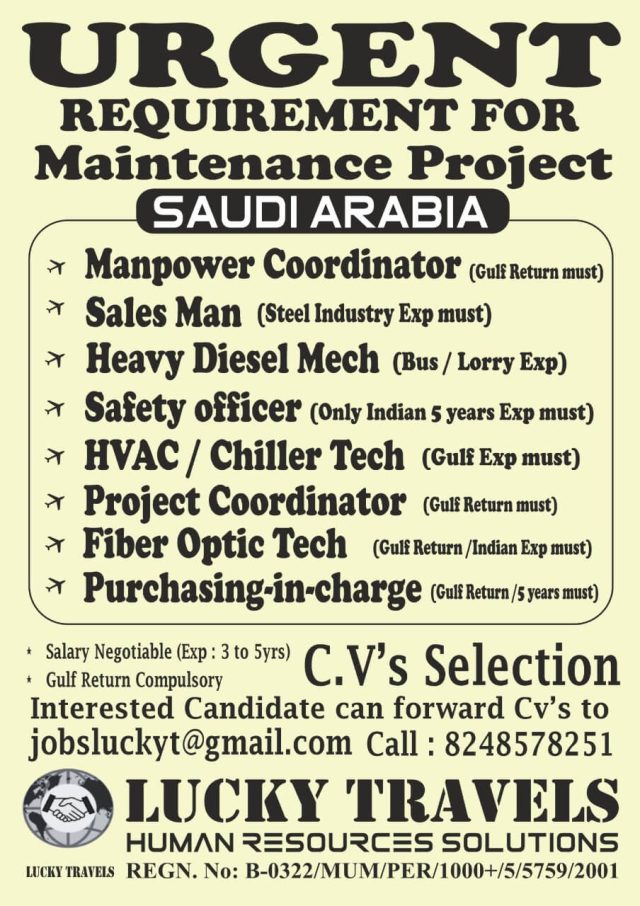 Saudi arabia job vacancy for indian - Urgent hiring