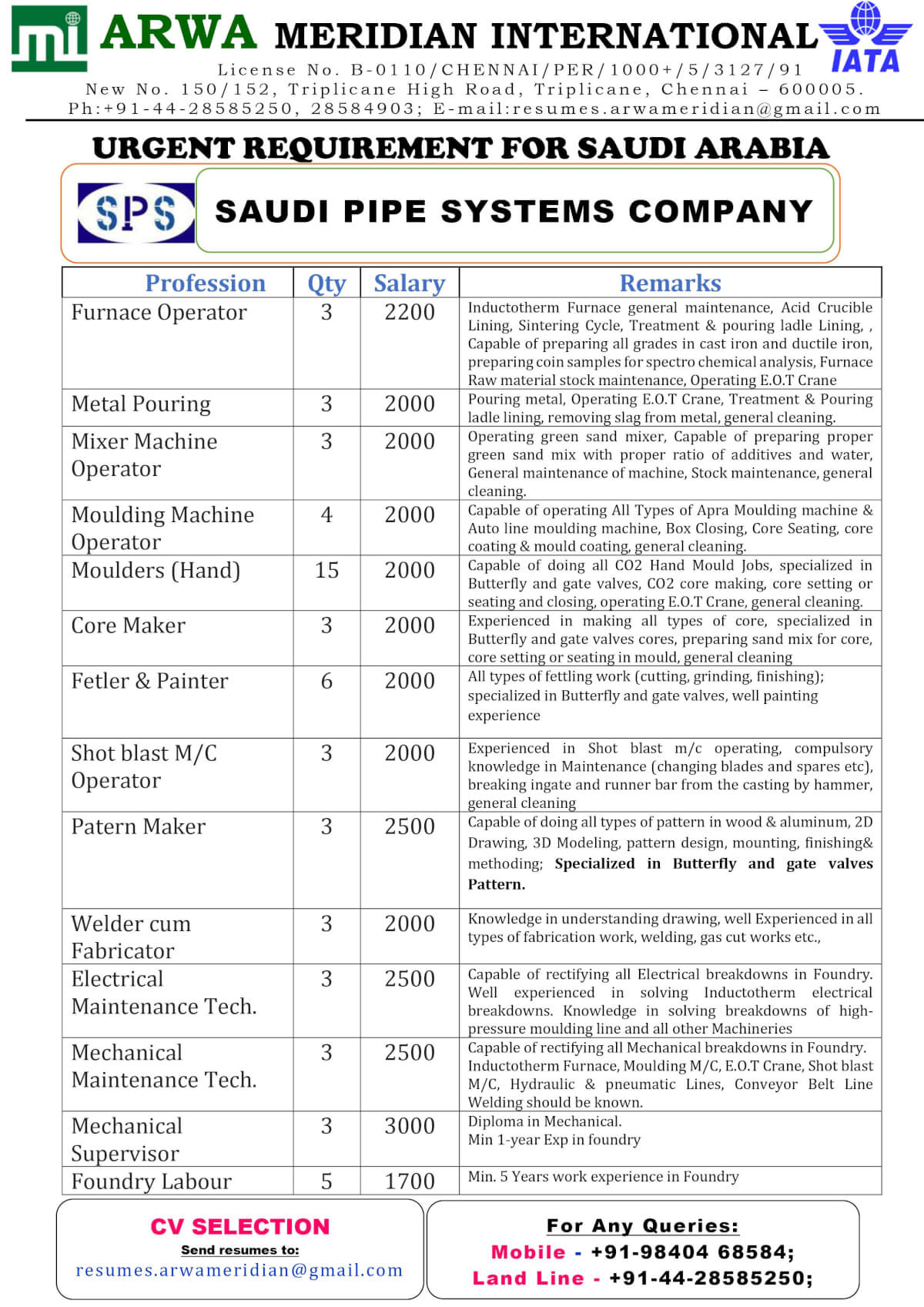 Saudi pipe systems company (SPS co.) - Urgent hiring
