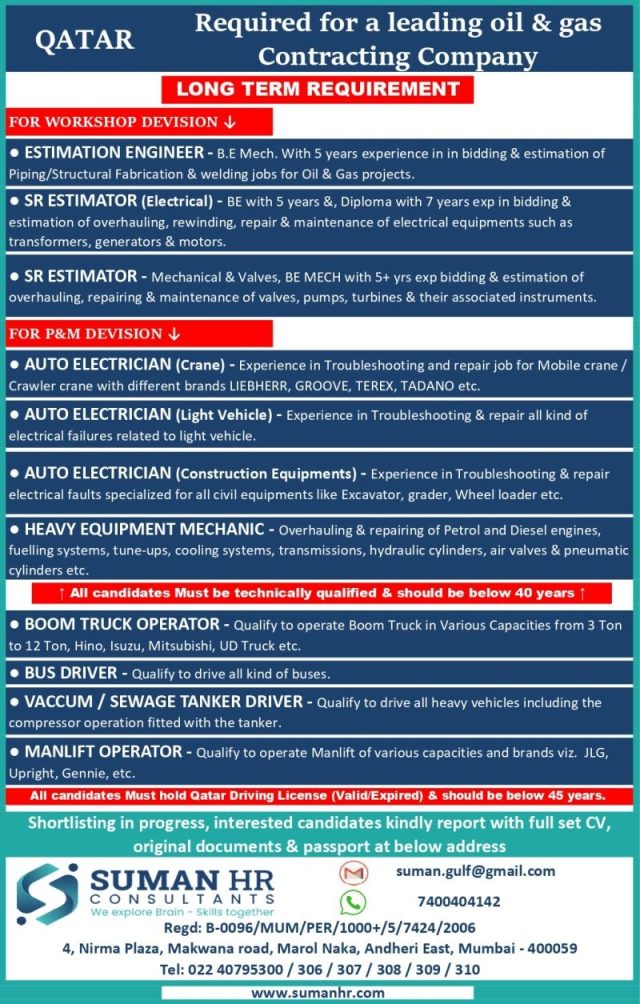 Qatar job vacancy for Indian - Oil & Gas Contracting Company