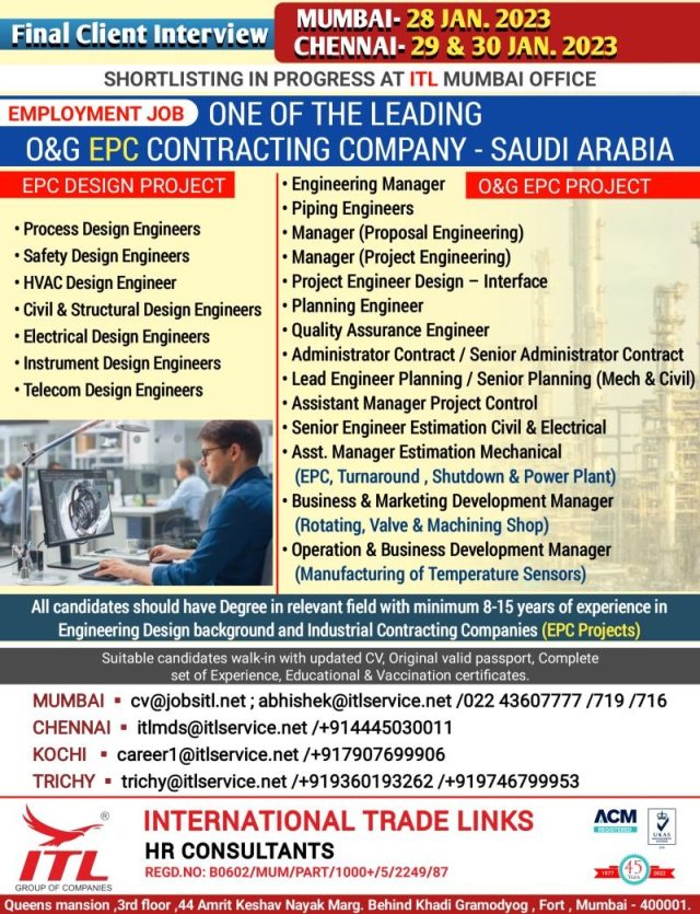 Walk-in-interview on 28th Jan 2023 at Mumbai & 29th & 30th Jan 2023 at Chennai