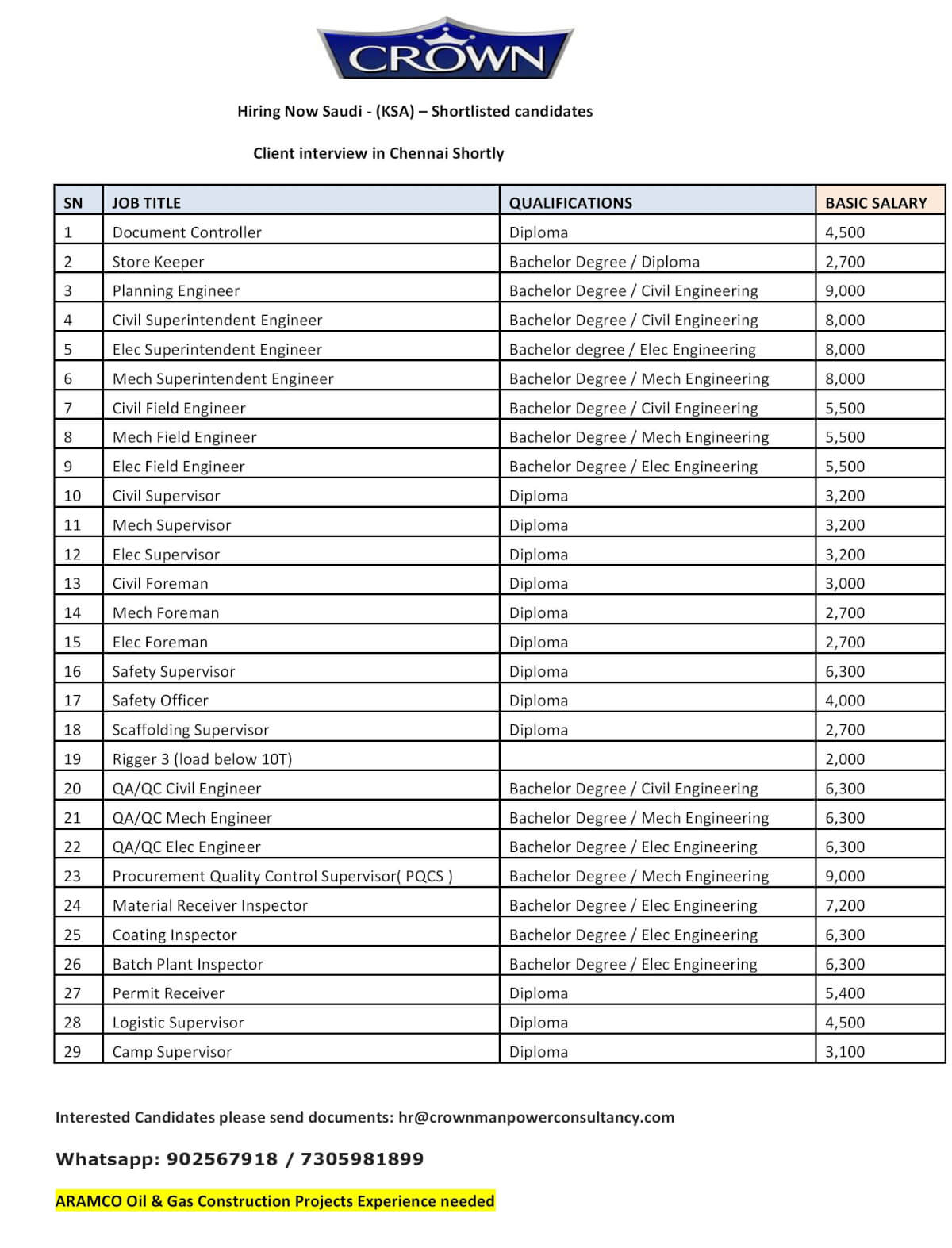 Candidates must have ARAMCO oil & gas construction projects experience