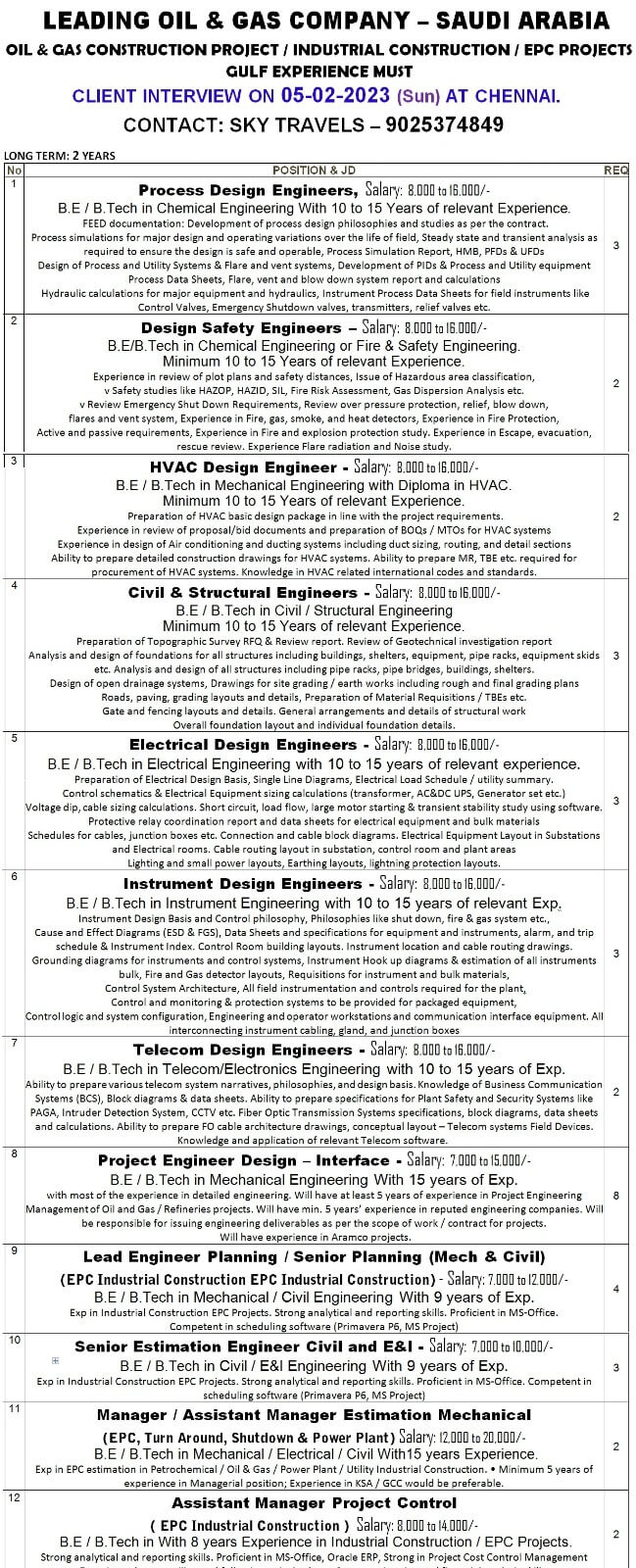 | Lead Engineers Planning / Senior Planning (Mech. & Civil) | 4 | 12000 SAR |