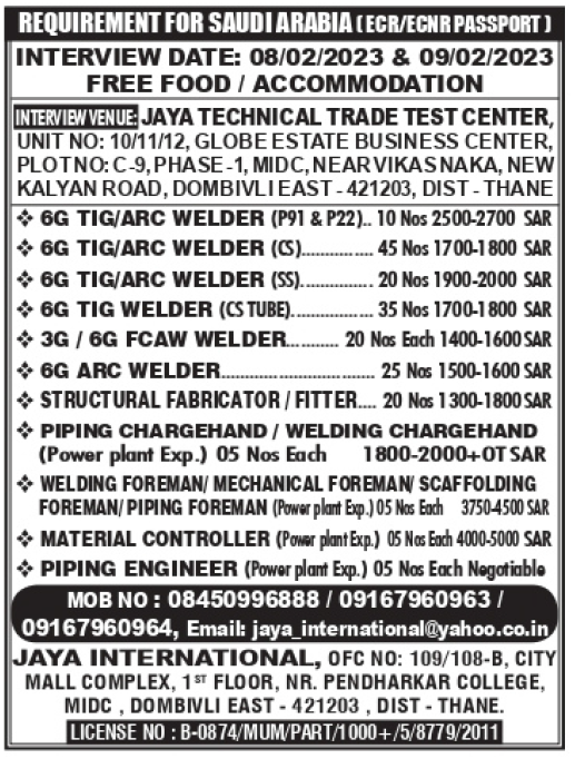 Walk-in-interview on 08/02/2023 & 09/02/2023 at Jaya Technical Trade Test Center, Unit No: 10/11/12, Globe Estate Business Center, Plot No: C-9, Phase No: 1, MIDC, Near Vikasnaka, New Kalyan Road, Dombivli estate, 421203, Dist - Thane