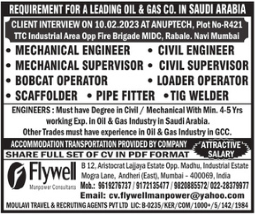 Engineers : Must have Degree in Civil / Mechanical with min. 4-5 years working exp. in Oil & Gas Industry in Saudi Arabia. Other Traders must have experience in Oil & Gas Industry in GCC