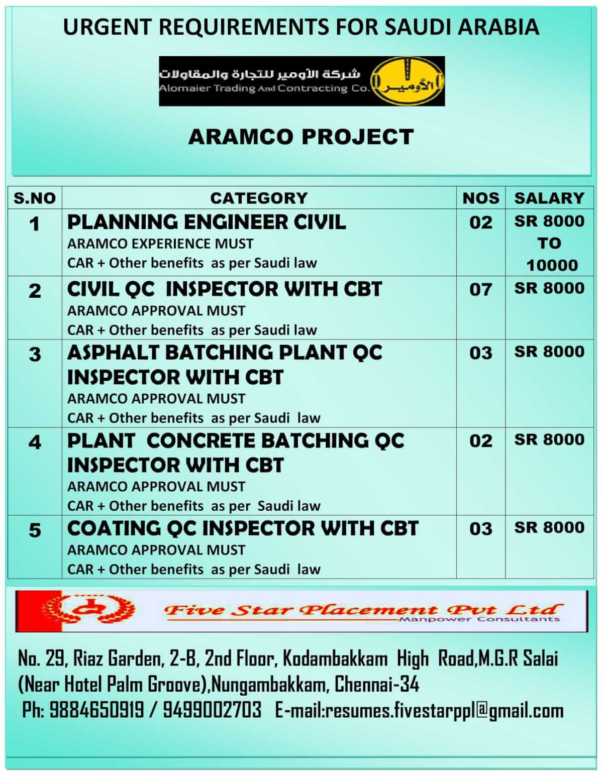 | Civil QC inspector with CBT | 7 | 8000 SAR |