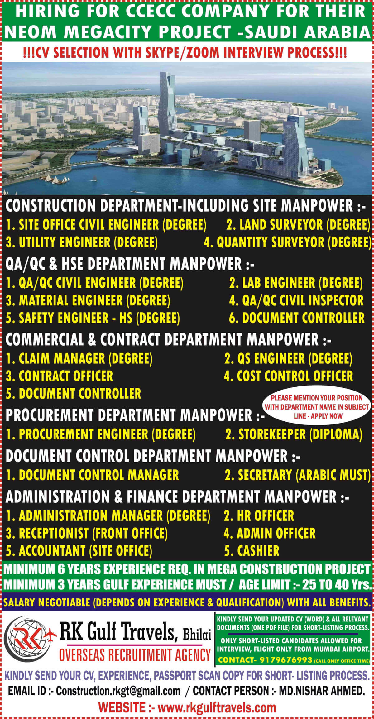 Candidates must have minimum 6 years experiencein mega construction experience instruction projects