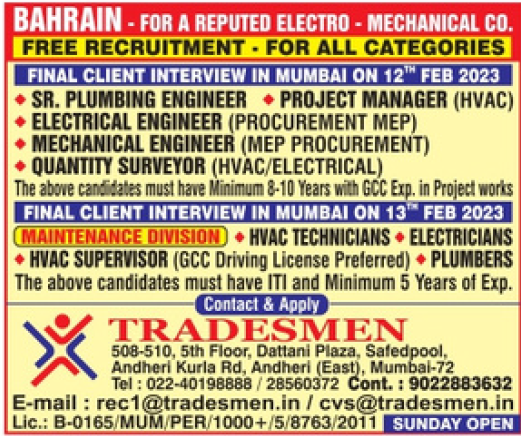 Email: rec1@tradesmen.in / cvs@tradesmen.in / 022-40198888 / 28560372 / 9022883632