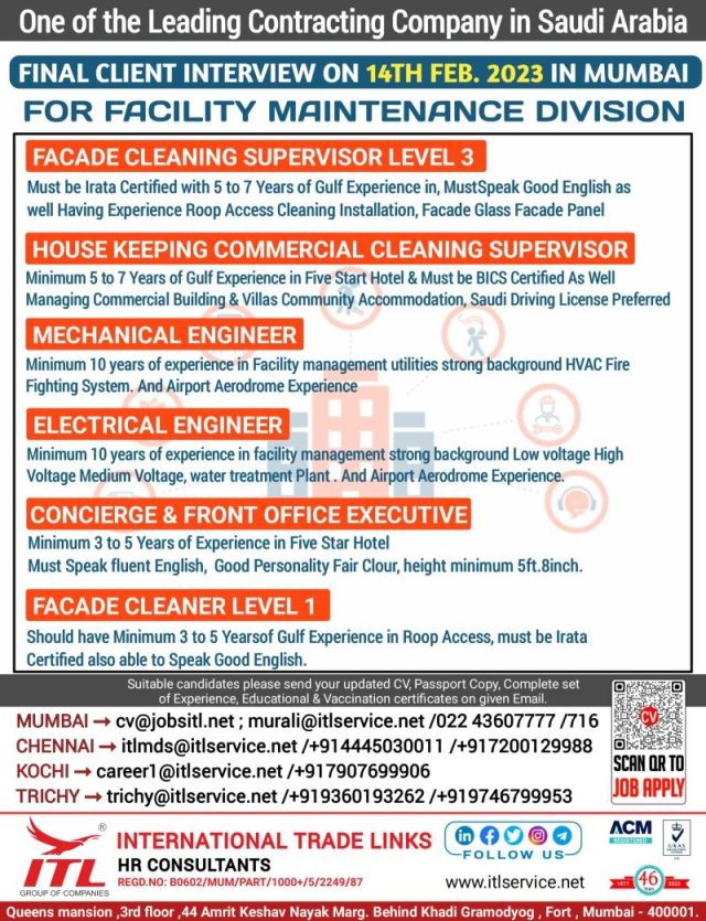 Email: Mumbai :- cv@jobsitl.net; murali@itlservice.net / 022 43607777 / 716