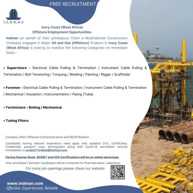 Jobs in Ivory coast for Indian - Free recruitment to Oil & Gas Offshore Project