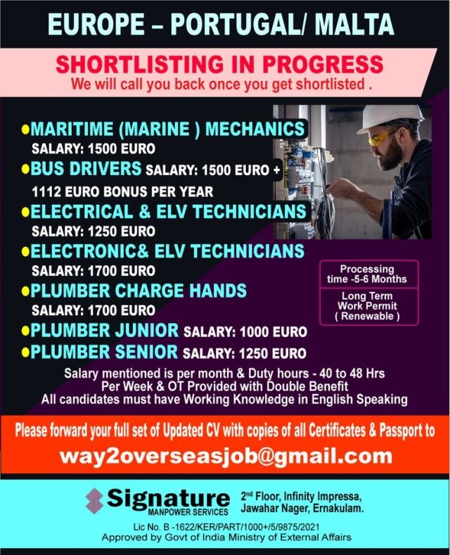 Signature Manpower Services, 2nd Floor, Infinity Impressa, Jawahar Nager, Ernakulam. Email: way2overseasjob@gmail.com