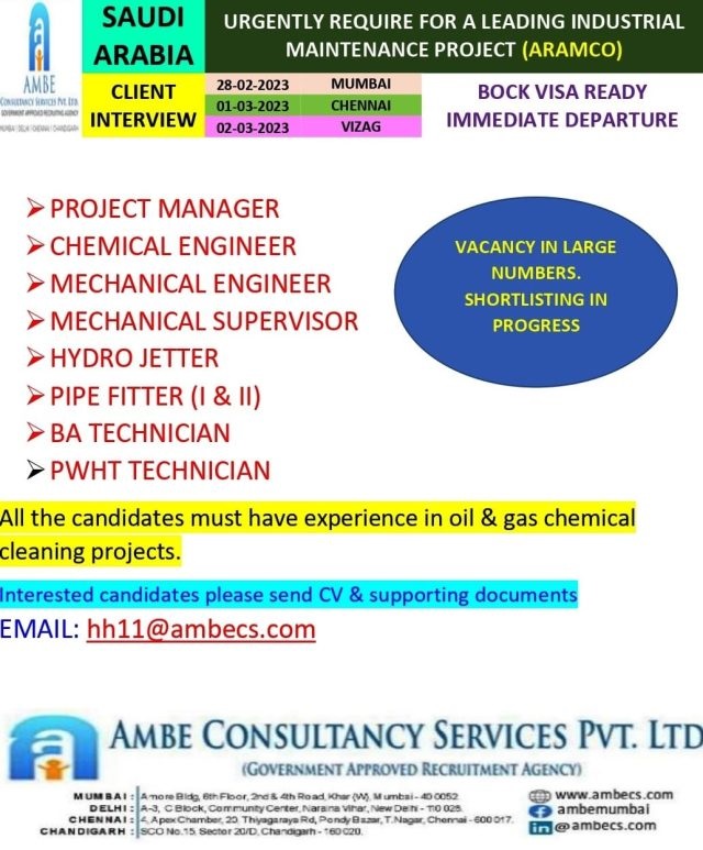 All the candidates must have experience in Oil & Gas Chemical cleanig Projects.