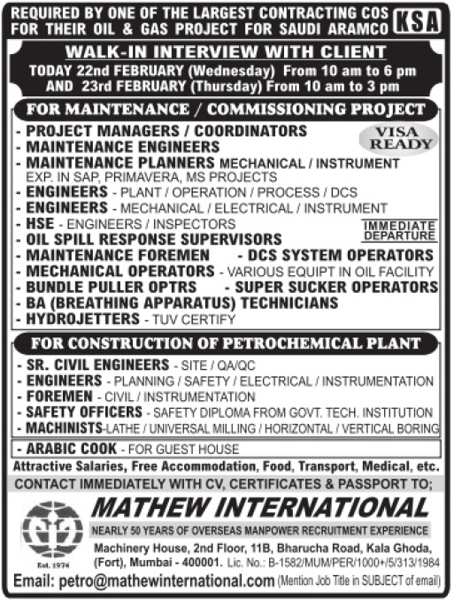 Recruitment to KSA - Saudi Aramco Oil & Gas Project