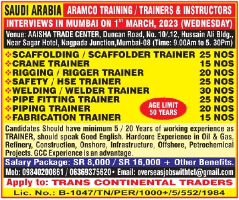 Candiates should have minimum 5/20 years of working experience as Trainer, Should speak Good Engilish. Hardore experience in Oil & Gas, Refinery, Construction, Onshore, Infrastructure, Offshore, Petrochemical Projects, GCC experience is an advantage. Age limit 50 yeras
