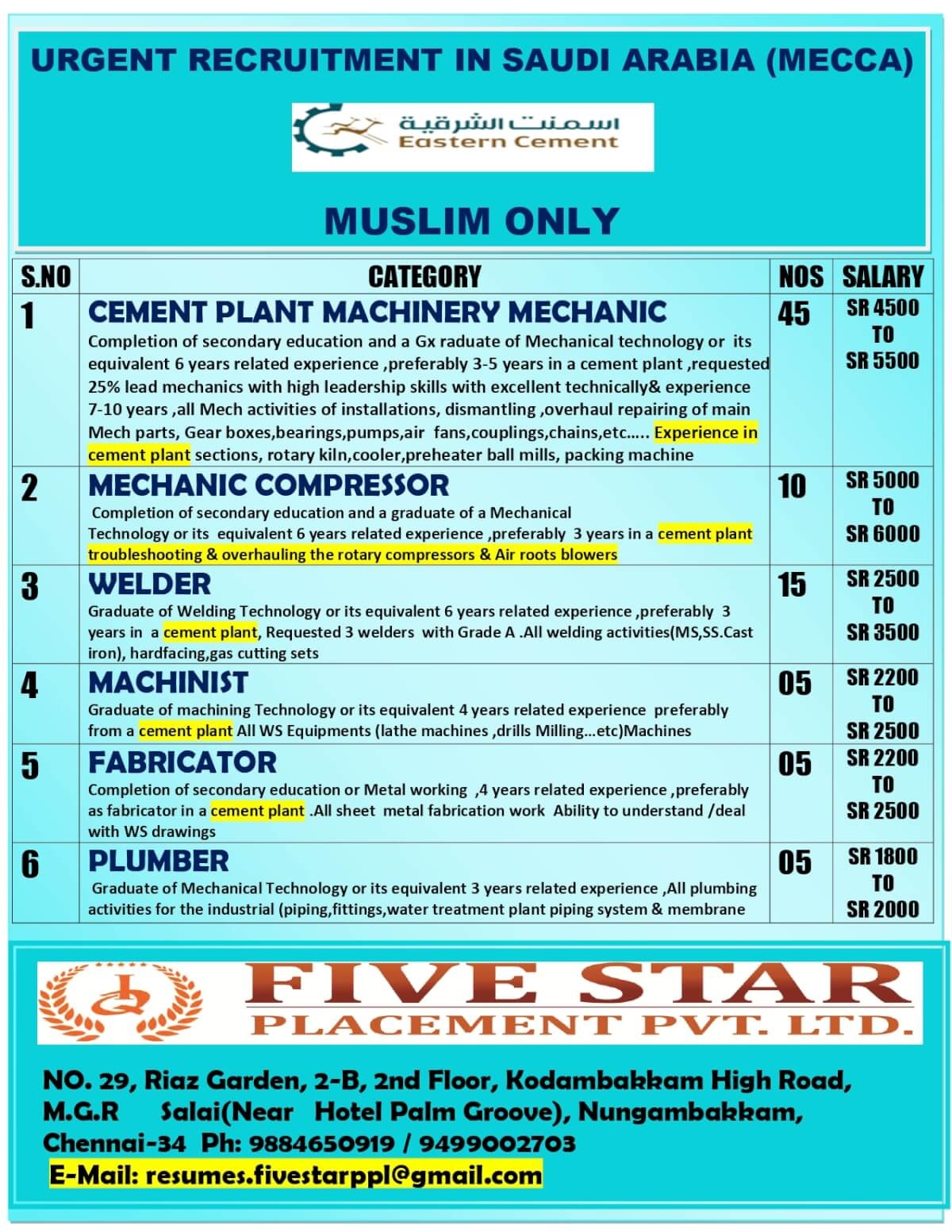 | Cement Plant Machinery Mechanic | 45 | 5500 SAR |
