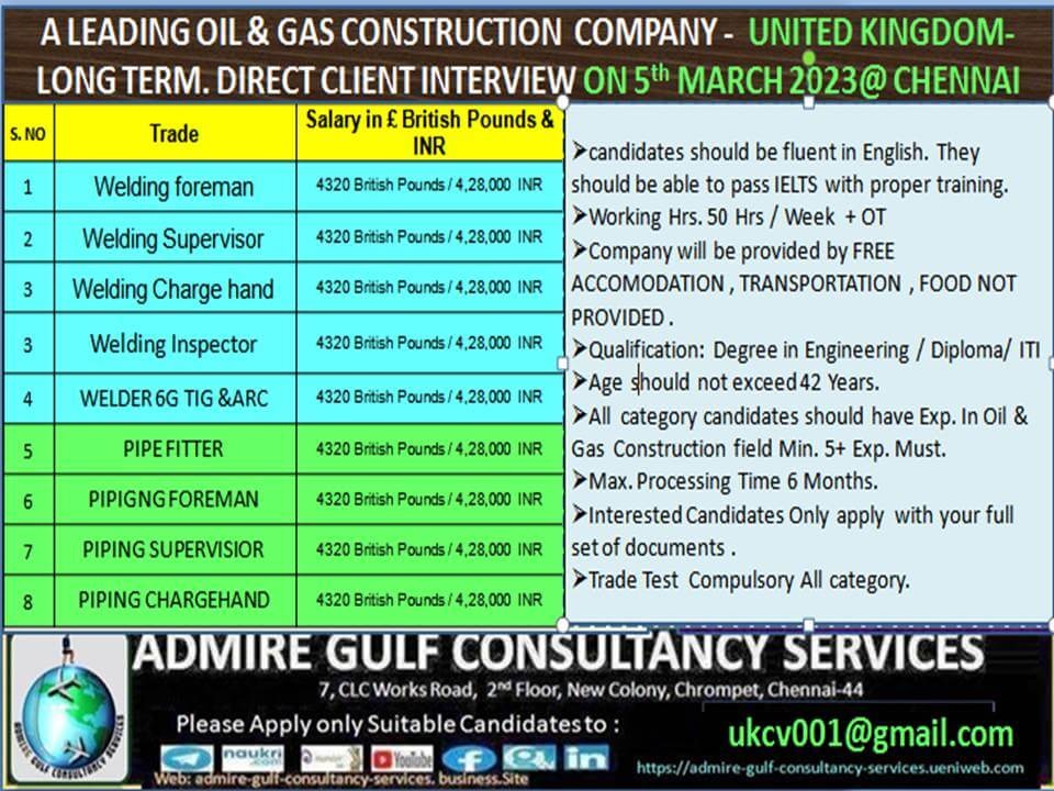 Job in UK for Indian - Oil & Gas Construction Company