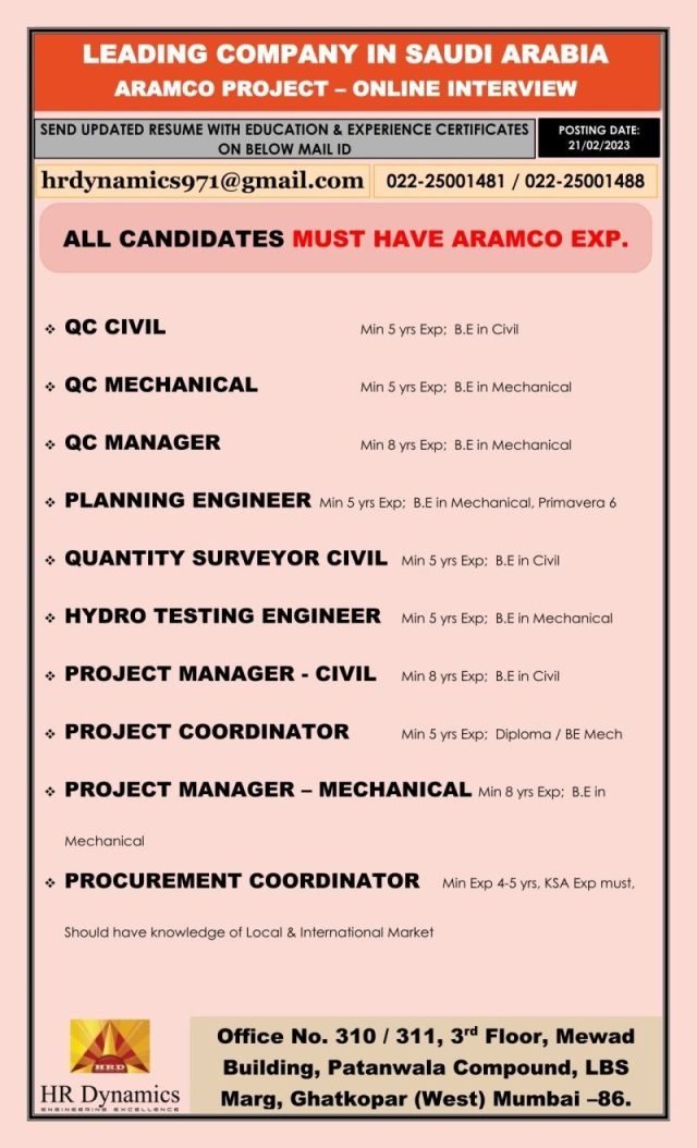 Aramco Project - Hiring for Saudi arabia