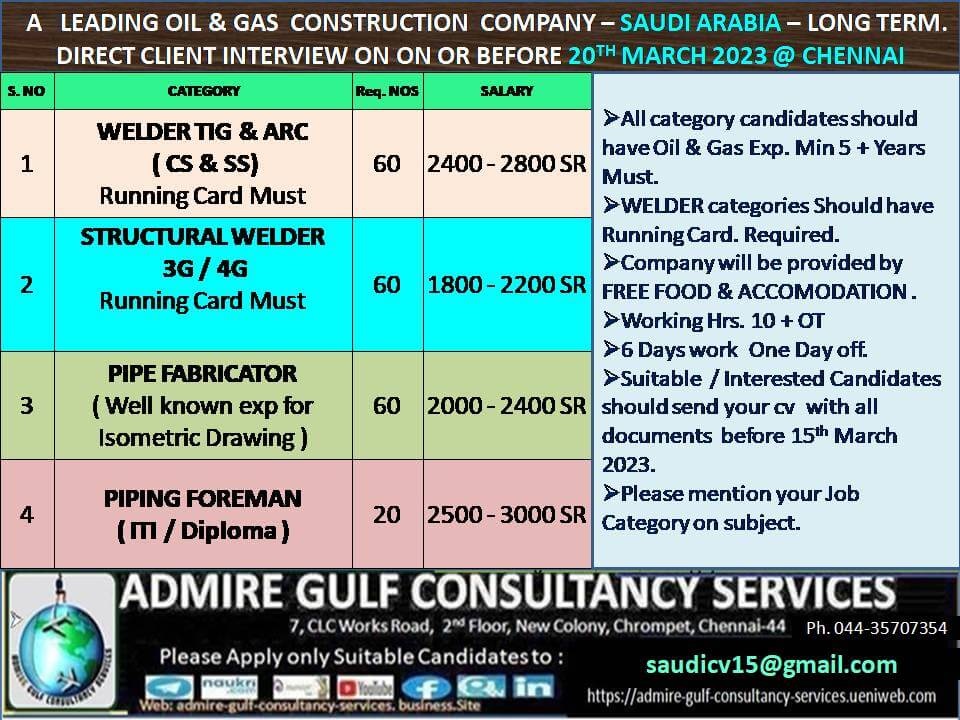 | Welder Tig & Arc (CS & SS) - running card must | 60 | 2800 SAR |