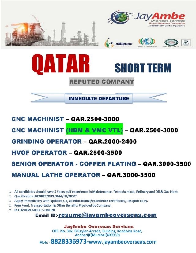 | CNC machinist (HBM & VMC VTL) | 3000 QAR | |