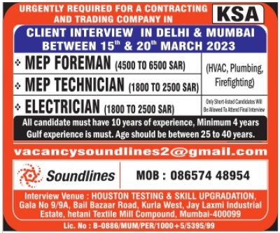 Email: vacancysoundlines2@gmail.com / 8657448954