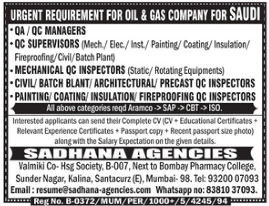QC Supervisors: (Mech./Elect./Inst./Painting/Coating/Insulation/Fireproofing/Civil/Batch Plant) | ||