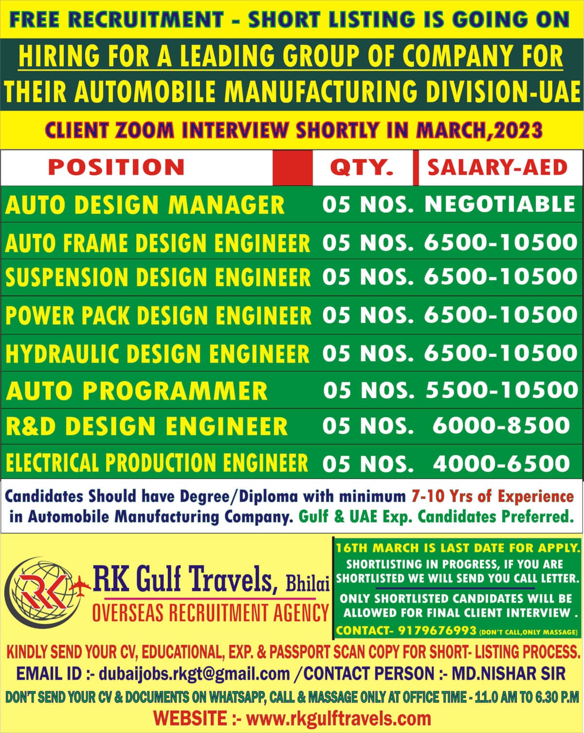 Candiates should have Degree/Diploma with minimum 7 - 10 years of experience in Automobile Manufacturing Company. Gulf & UAE experience candidates preferred.