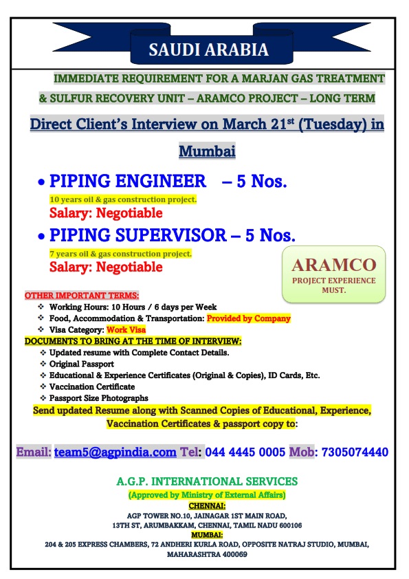 | Piping Supervisor | 05 | Negotiable |