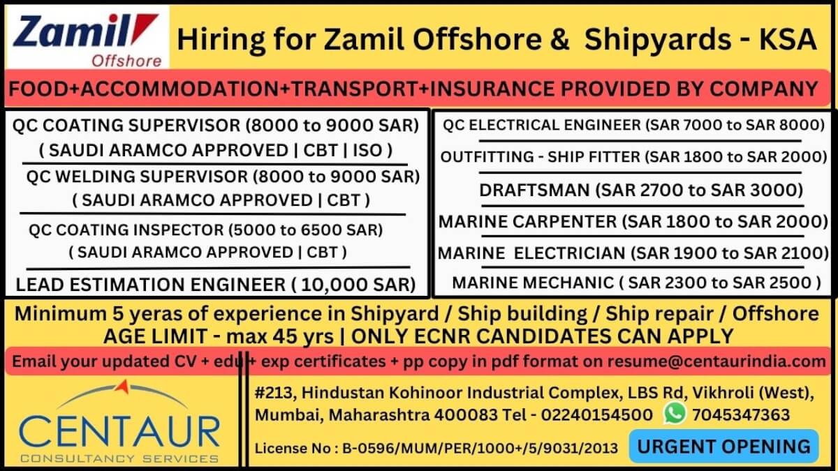 Minimum 5 years of experience in Shipyard/Ship building/Ship repaire/Offhore. Age limit 45 years, Only ECNR Candidates can apply.