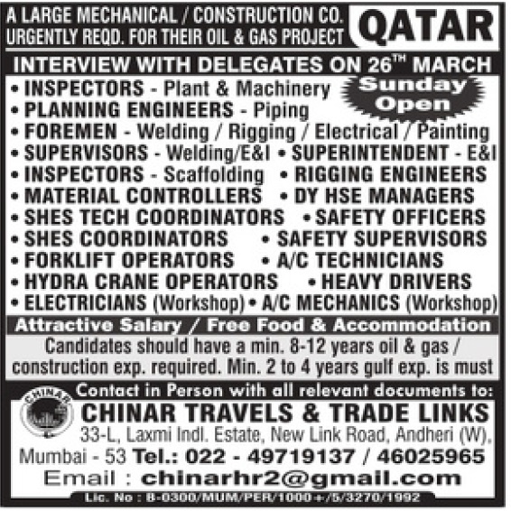 Candidates should have a Min. 8-12 years Oil & Gas / Construction exp. required. Min. 2 to 4 years gulf exp. is must