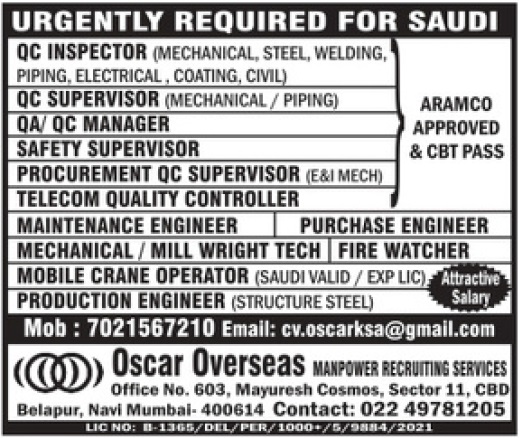 QC Inspector (Mechanical, Steel, Welding, Piping, Electrical, Coating, Civil) | ||