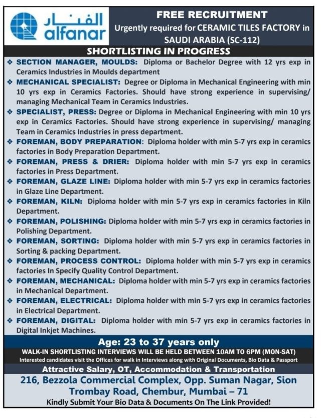 Alfanar ceramics jobs - Free recruitment to Saudi arabia