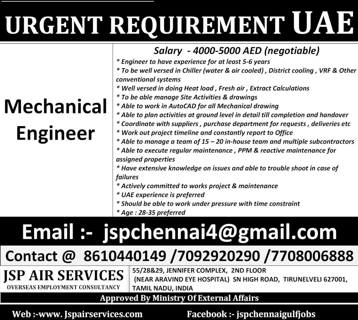 Mechanical engineer job in UAE - Urgent hiring