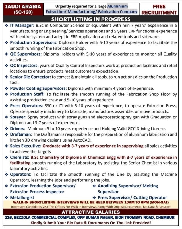 Free recruitment to Saudi arabia - Aluminium Extraction/Manufacturing/Fabrication Company
