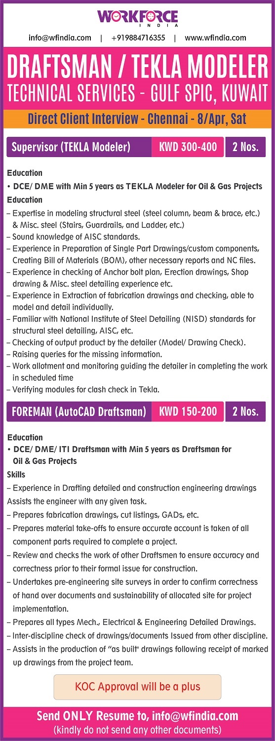 Foreman (Auto CAD draftsman) | 2 | 200 KWD |