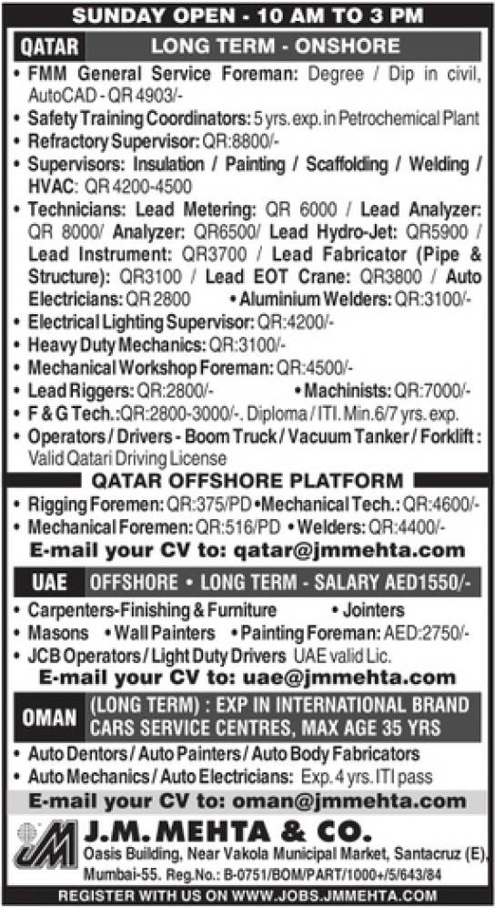 Supervisors - insulation/painting/scaffolding/welding/HVAC | 4500 QAR | |