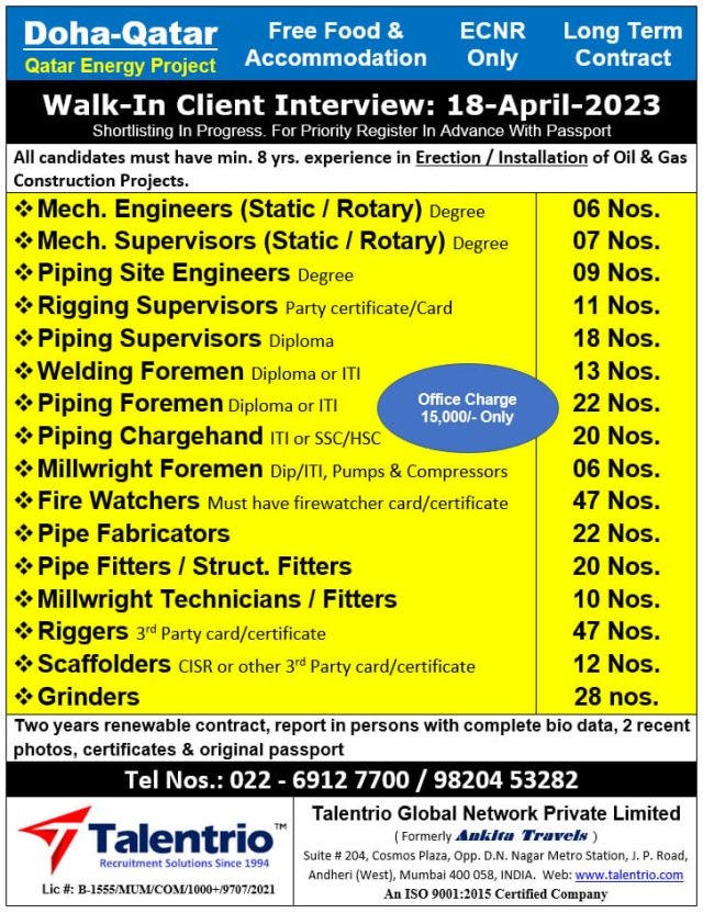 All Candidates must have Min. 8 yrs. experience in Erection / Installation of Oil & Gas Construction Projects.