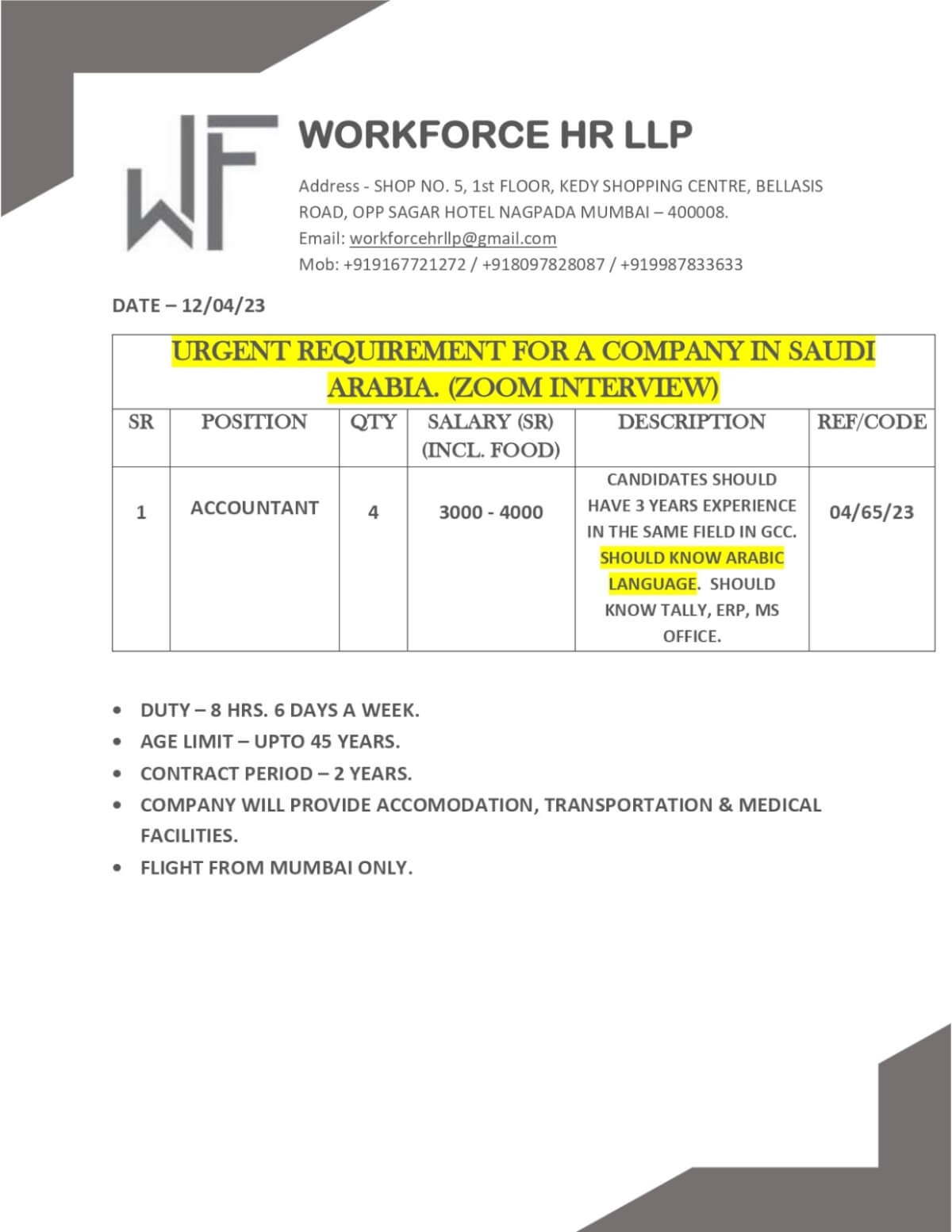 Workforce HR LLPShop No: 5, 1st Floor, Kedy Shopping Centre, Bellasis Road, Opp. Sagar Hotel Nagpada, Mumbai - 400008Email: workforcehrllp@gmail.comMob: 8097828087, 9167721272, 9987833633