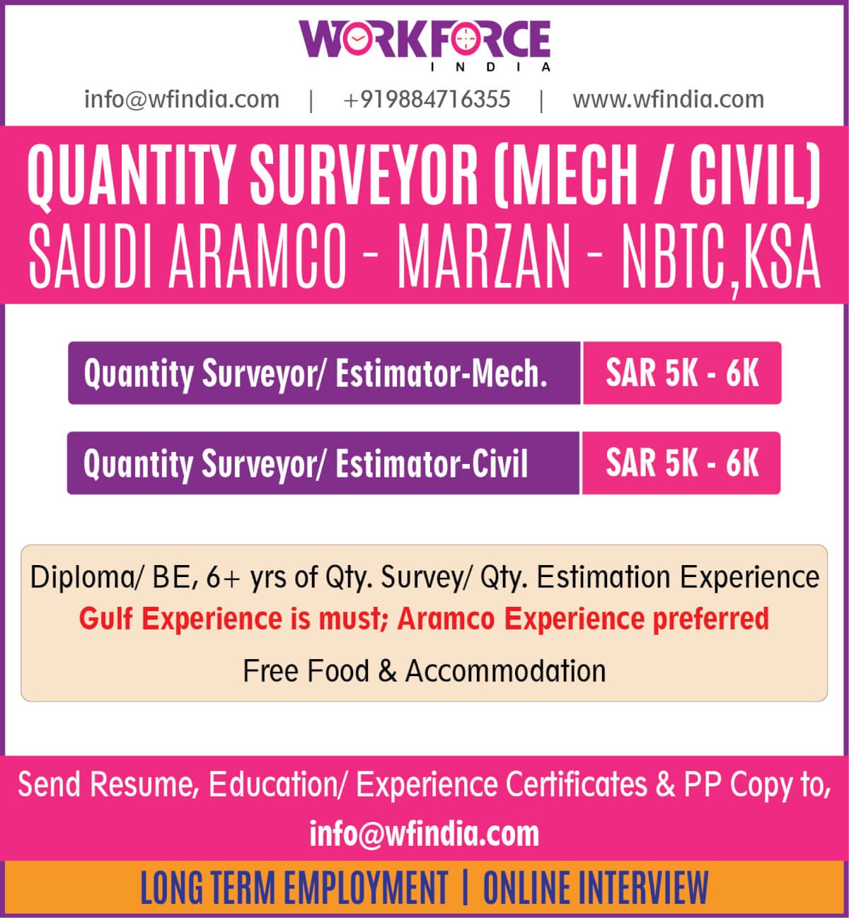 Diploma/BE, 6+ years of Qty. Surveyor/Qty. Estimation experience. Gulf Experience is must, Aramco Experience preferred