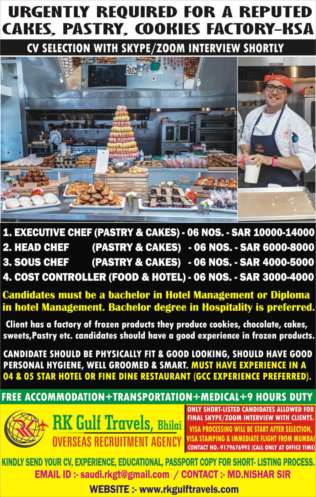 | Head Chef (Pastry & Cakes) | 06 | 8000 SAR |