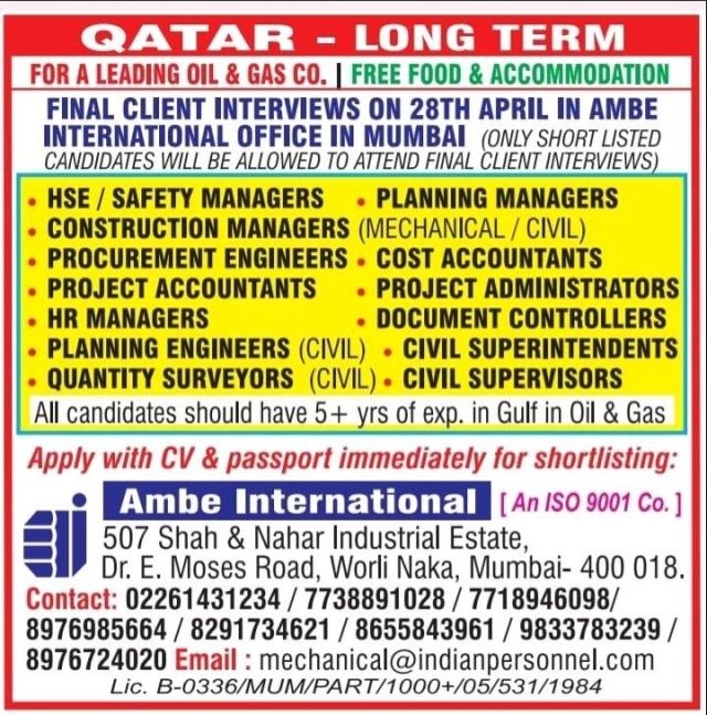 Email: mechanical@indianpersonnel.com / 022 61431234, 7738891028, 7718946098, 8976985664, 8291734621, 8655843961, 9833783239, 8976724020
