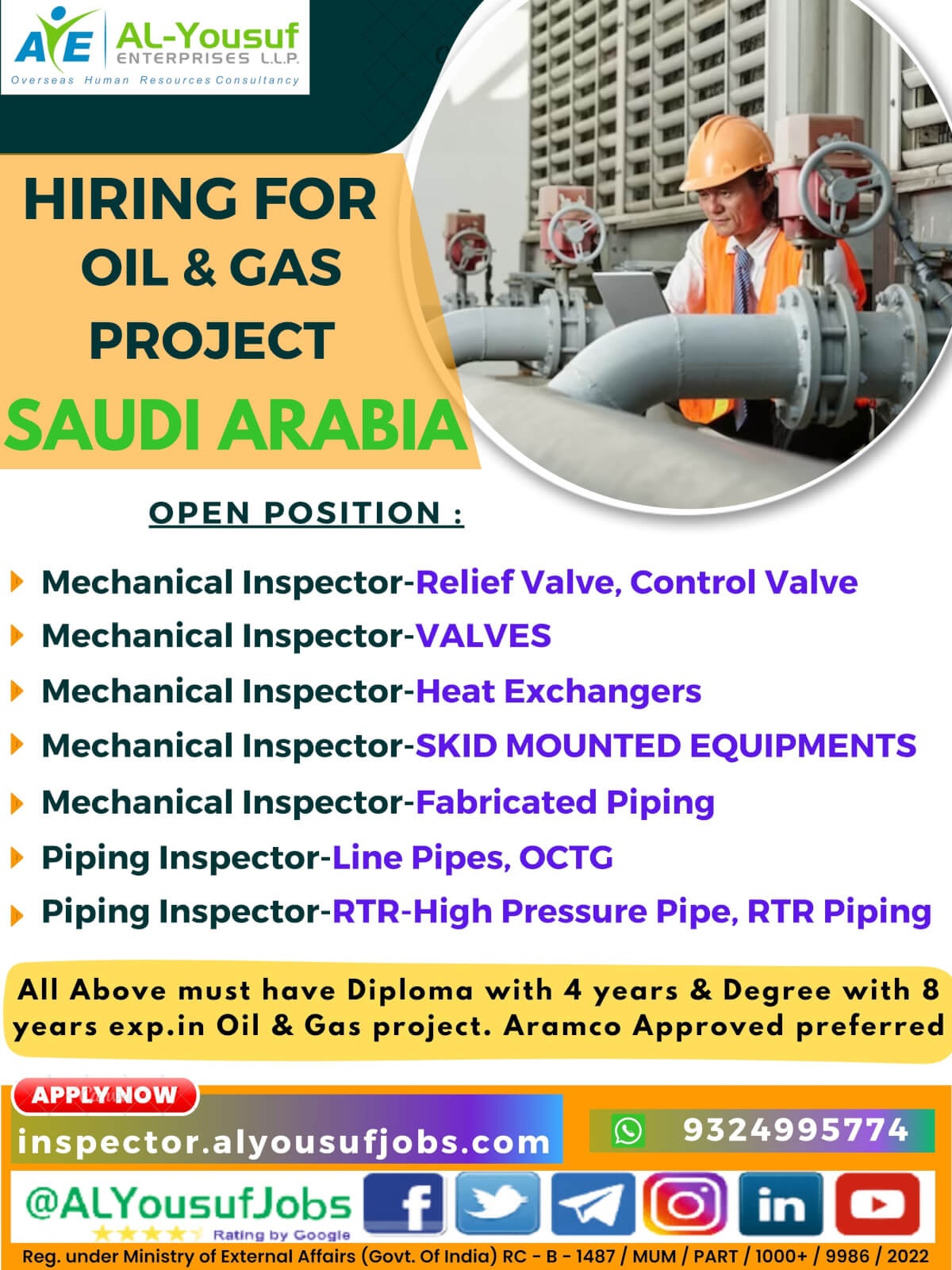 All above must have Diploma with 4 years & Degree with 8 years exp. in Oil & Gas project. Aramco Approved preferred.