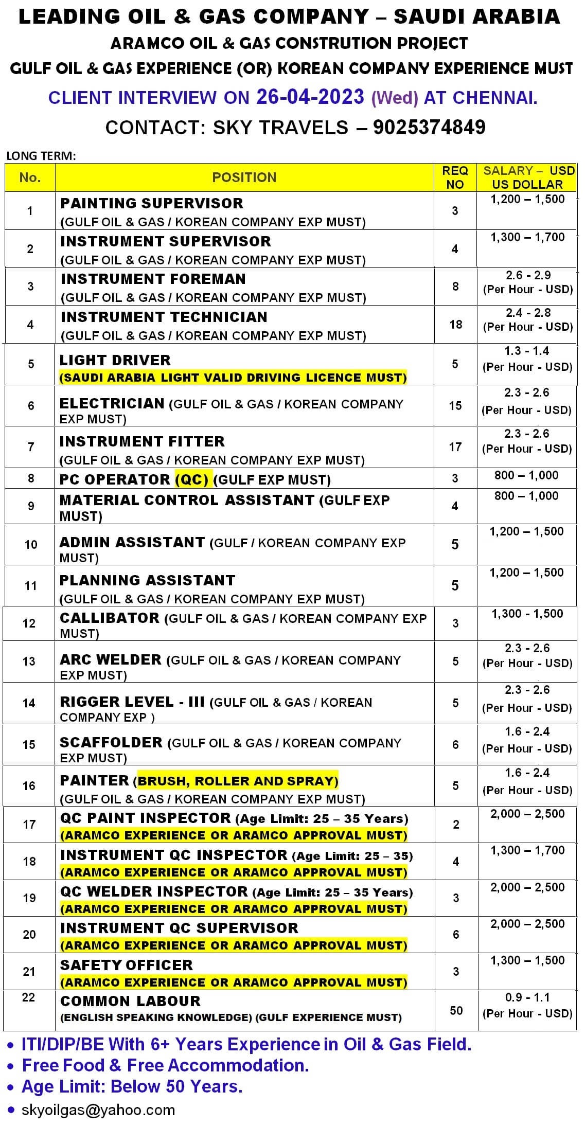 ITI / Diploma / BE with 6+ years of experience in Oil & Gas field. Age Limit below 50 years