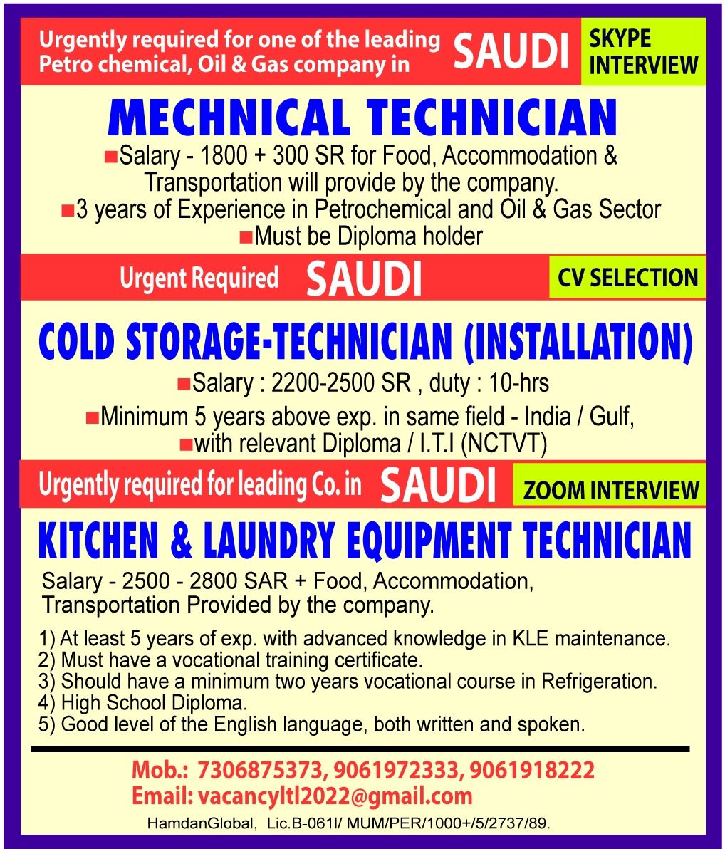 Wanted for Saudi Arabia - Urgently required